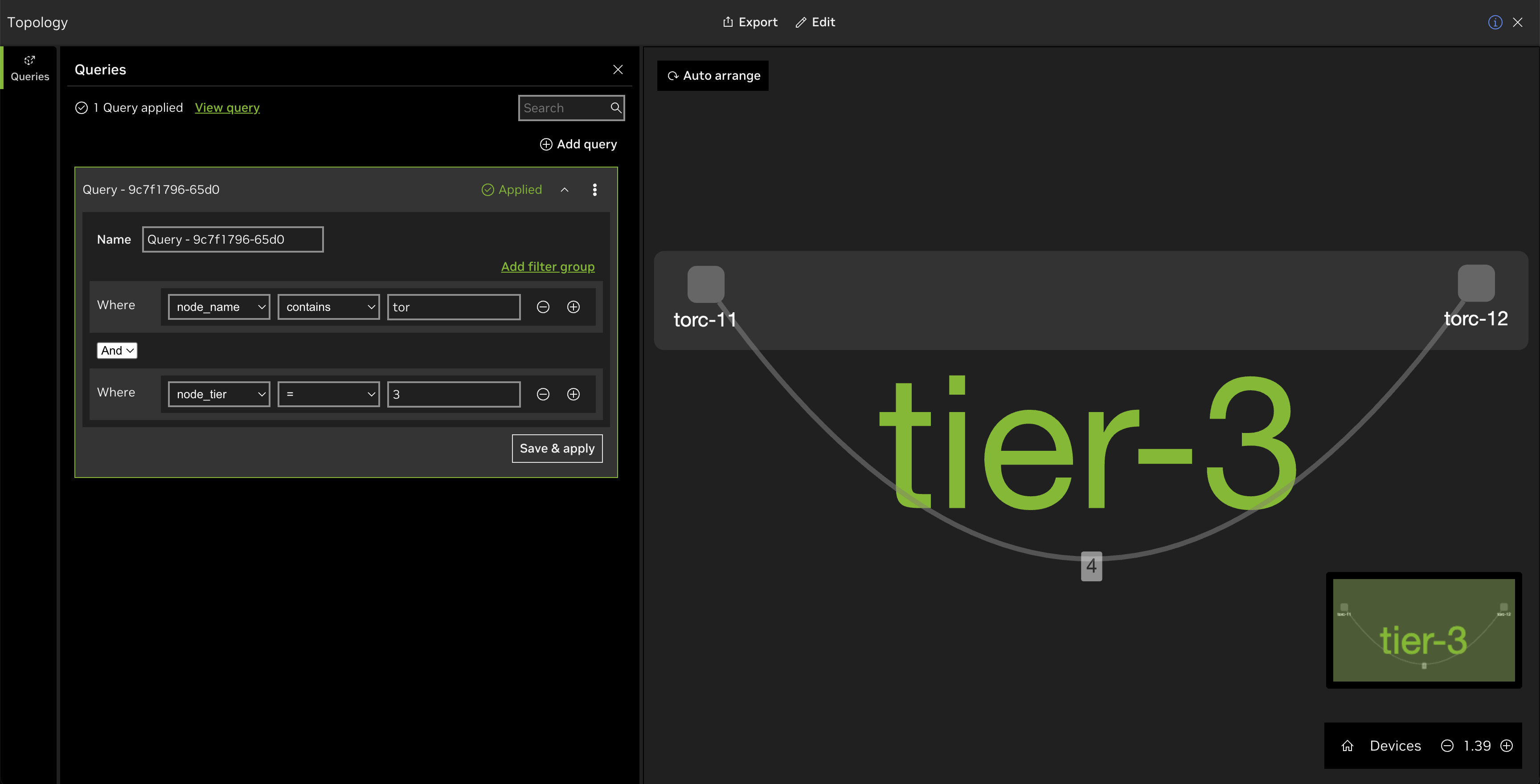 You can select between node_name and node_tier to display either a subsection of nodes based on their names or the tiers where they’re located, respectively. Select Add filter group to combine queries with logical operators. For example, the following filter group consists of two queries: one displaying any node containing the letters “tor” and of those nodes, those located in tier three: