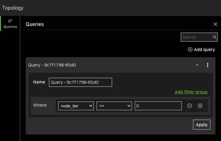 You can create queries to segment a topology into smaller, more manageable parts. This can be especially helpful when you need to view a particular section of a very large topology. To create a query, select Queries on the left side of the screen, then Add query. The name of the query is pre-populated with a unique identifier that you can edit by selecting the field.