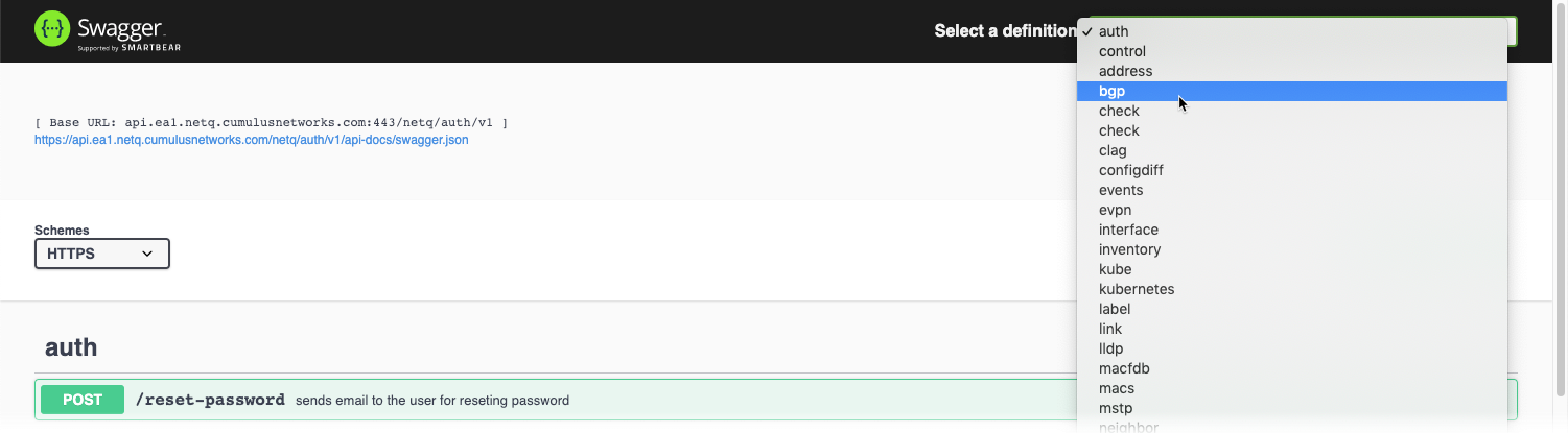 - Cumulus in the Cloud (CITC): https://api.air.netq.nvidia.com/swagger/