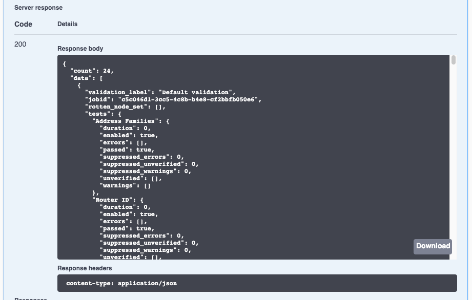 curl -X GET "<https://<netq.domain>:<port>/netq/telemetry/v1/object/check?time=1597256560&duration=24&by=scheduled&proto=bgp" -H "accept: application/json" -H "Authorization: <auth-token> " | python -m json.tool