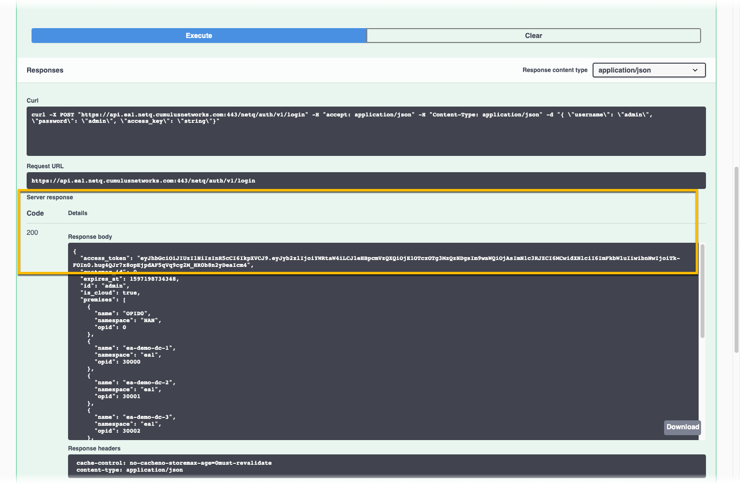 <computer-name>:~ <username>$ curl -X POST "https://api.192.168.0.10.netq.nvidia.com:443/netq/auth/v1/login" -H "accept: application/json" -H "Content-Type: application/json" -d "{ \"username\": \"admin\", \"password\": \"admin\", \"access_key\": \"string\"}"The output provides the access token as the first parameter.