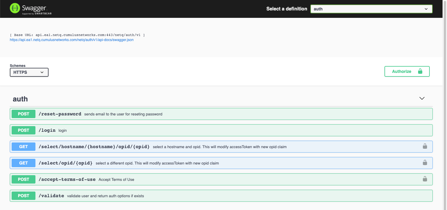 Select auth from the Select a definition dropdown at the top right of the window. This opens the authorization API.