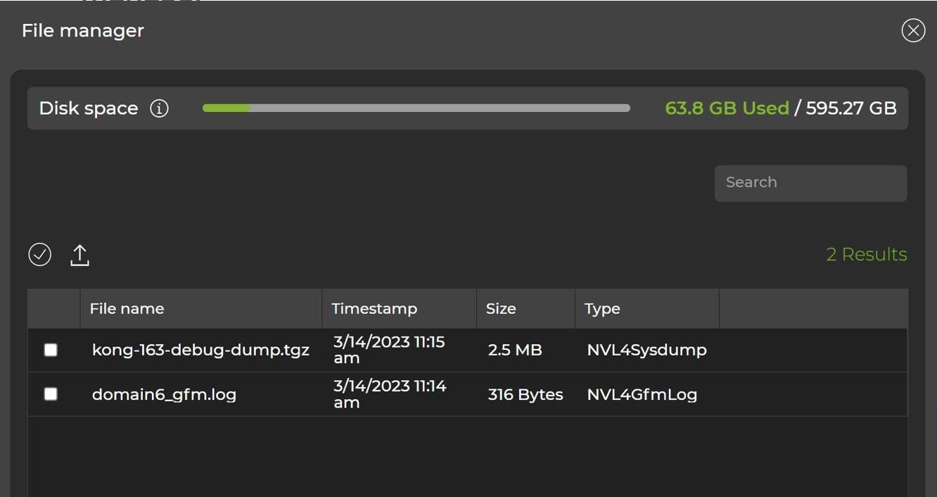 Use the NetQ UI to generate and download diagnostic files for debugging. You can generate system dumps for NVLink L1 and L2 switches and GFM logs for a given domain. Note that after you delete a domain, you will not be able to generate or download debugging files and any files previously generated for the domain will also be deleted.
