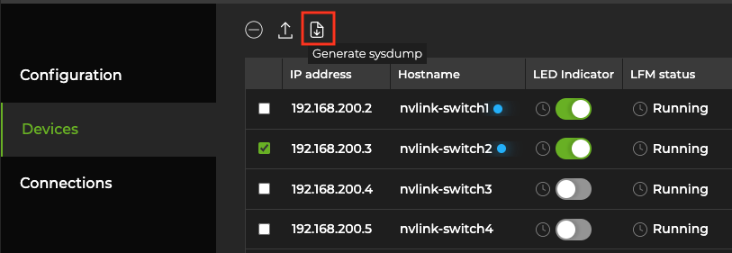 Select up to 5 devices, then select the Generate sysdump icon above the table.