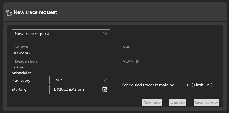 You can modify scheduled traces at any time as described below. An administrator can also manage scheduled traces through the NetQ management dashboard.