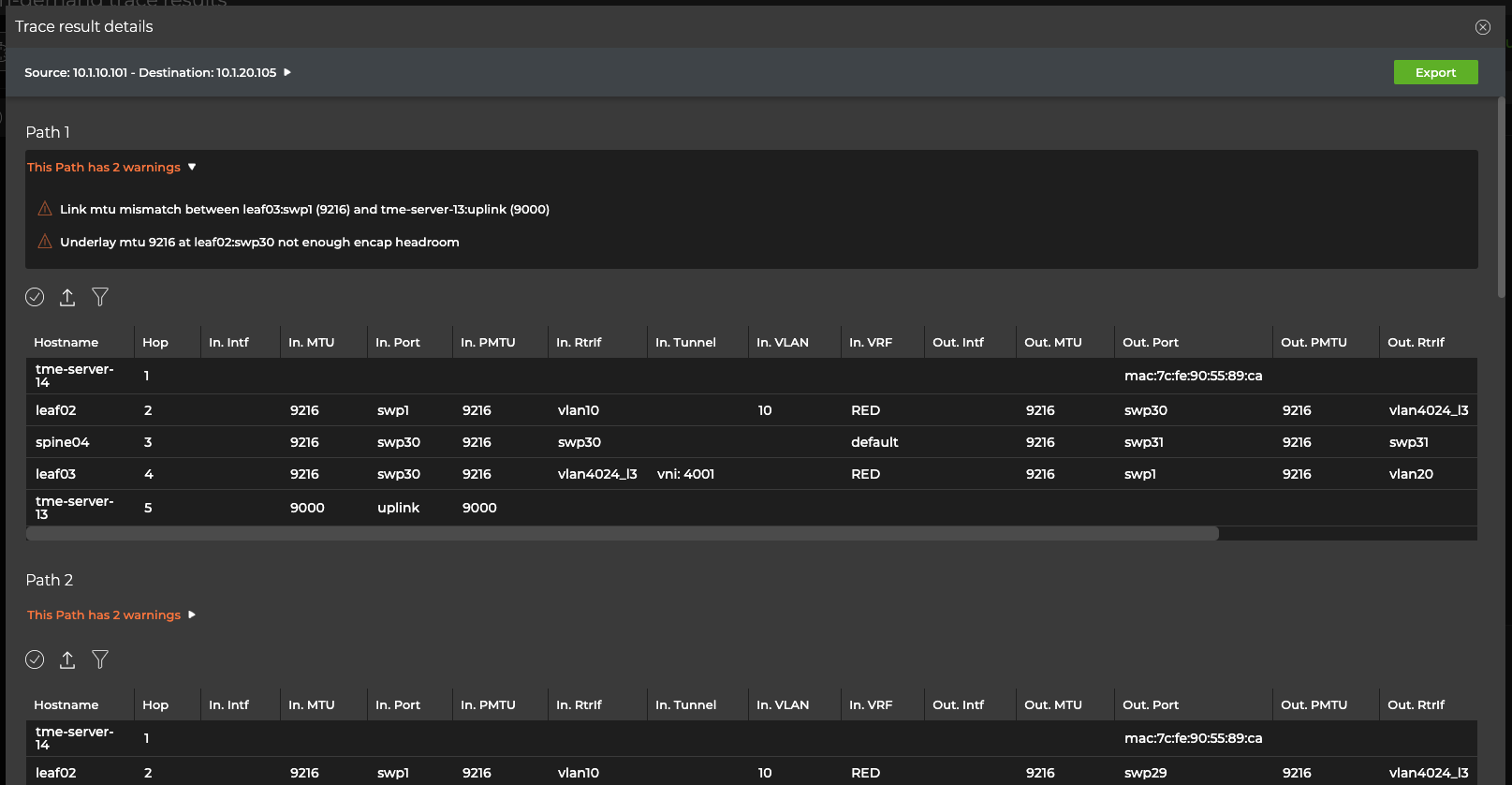 In this example, 8 of 12 paths use four hops to get to the destination and four use three hops. The overall MTU for all paths is 9216. No errors or warnings are present on any of the paths.