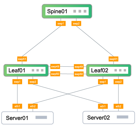 - On server01, connect eth1 to swp1 on leaf01 and eth02 to swp1 on leaf02.