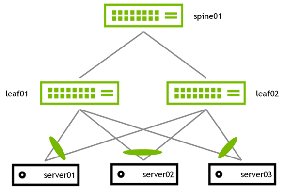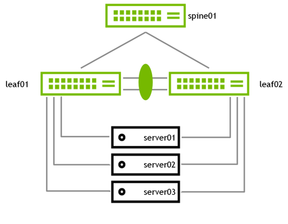 MLAG enables a pair of switches to act redundantly in an active-active architecture and appear as a single, logical device from the perspective of the host. The two switches in an MLAG pair are connected by a link or bonded links called the peer link. In a basic MLAG configuration, as shown in Figure 5, leaf01 and leaf02 are MLAG peers. MLAG is on three bonds, each with a single port, a peer link that is a bond with two member ports, and three VLANs on each port.