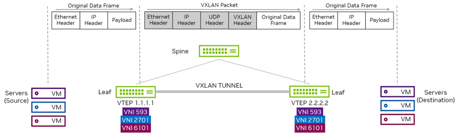 When a host sends traffic that belongs to a VNI, as shown in figure 2, the traffic is encapsulated in UDP and IP headers. This is then sent across the underlay network, just like normal IP traffic. When the packet reaches the destination switch, the packet is decapsulated and delivered to the destination server.