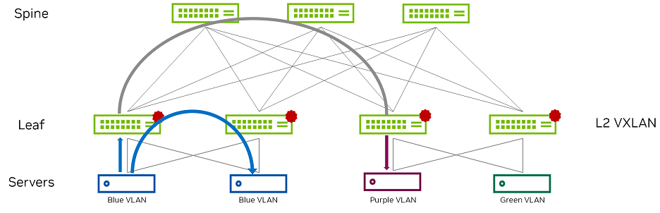 - The leaf switches only need to host the VLANs and the corresponding VNIs that are located on its rack, as well as the L3VNI and its associated VLAN. The ingress leaf switch doesn’t need to know the destination VNI.