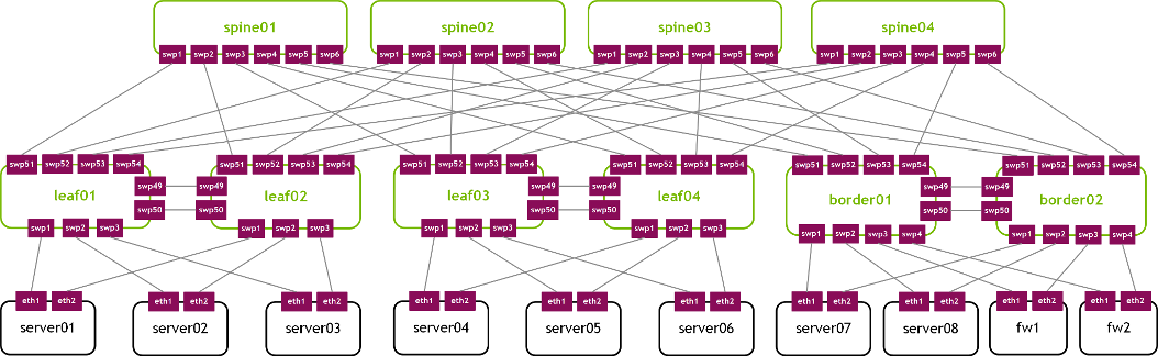 Typically, servers are interconnected to the leaf through lower-speed links and the switches are interconnected by higher-speed links. A common deployment is to interconnect servers to leaves through 25 Gbps links, while interconnecting switches with one another through 100 Gbps links. In AI/ML environments, you can also have higher bandwidth servers with 50/100G network interface cards and 200/400G interconnects.
