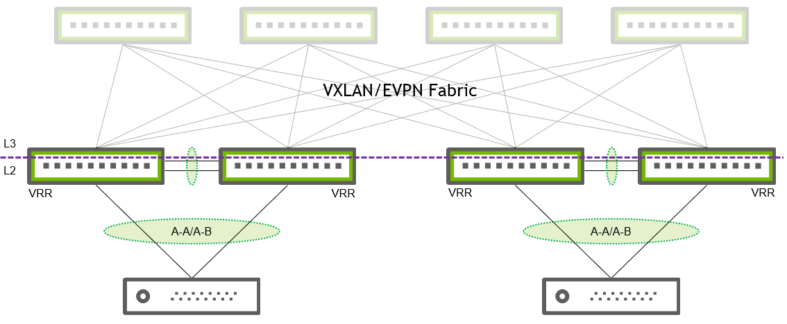 - Active-Active VXLAN - An extended layer 2 domain over layer 3 networks using VXLAN and EVPN. Such deployments can use VXLAN layer 2 stretch or routing configurations.