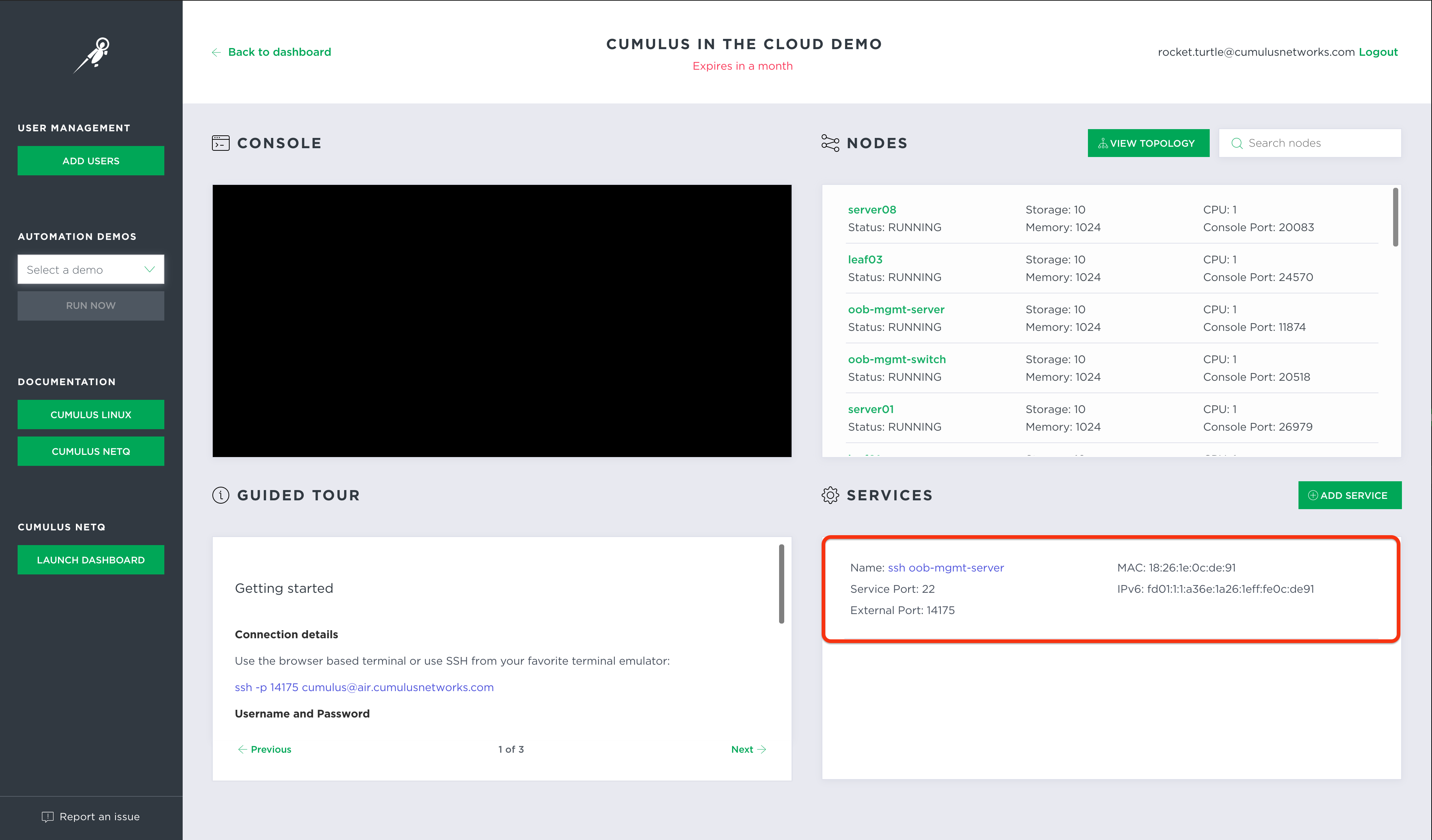 oob-mgmt-serverin your Cumulus in the Cloud simulation. For the best experience, use an SSH client to connect. Find the SSH client connection information from the Services window in the UI.