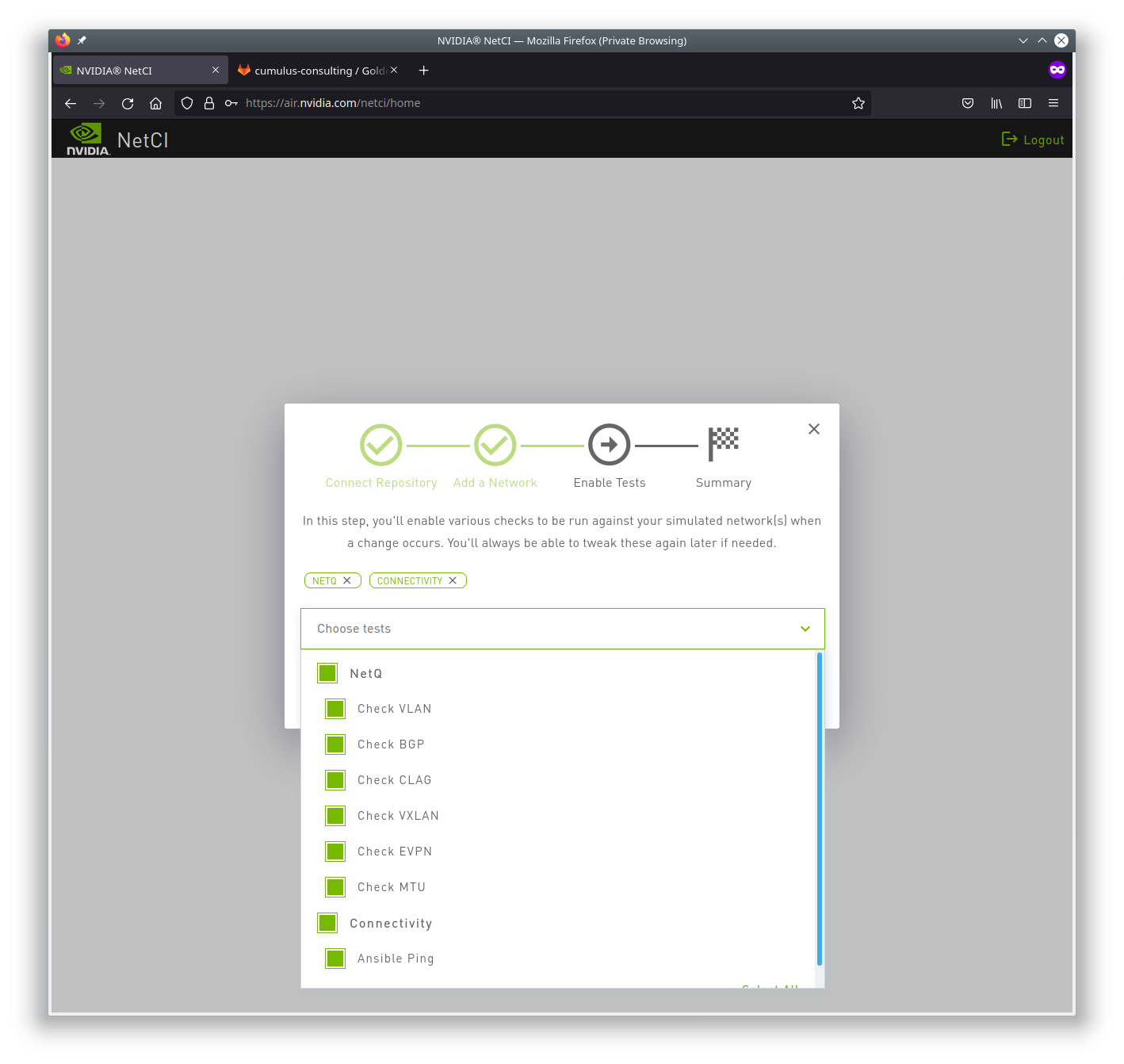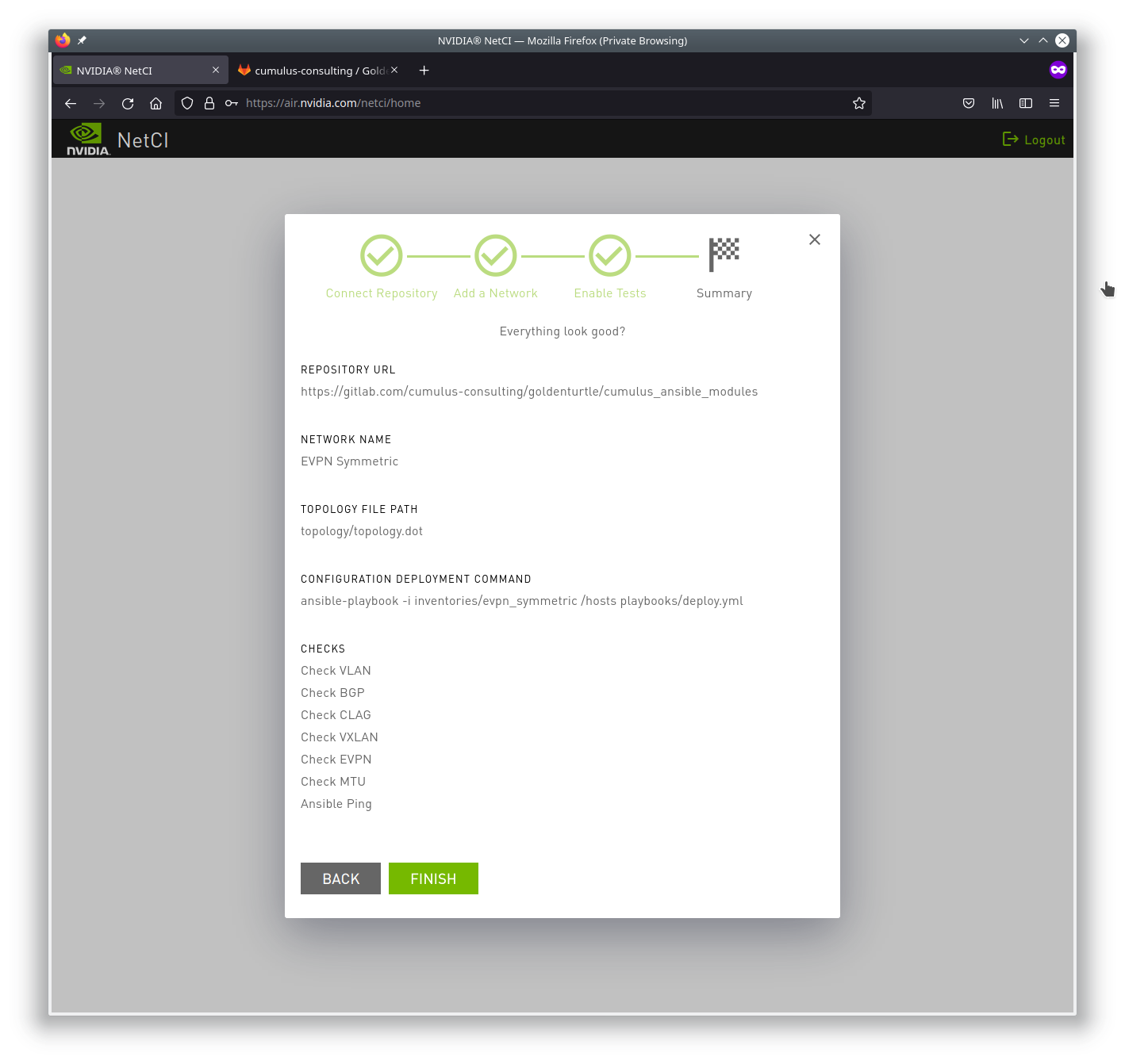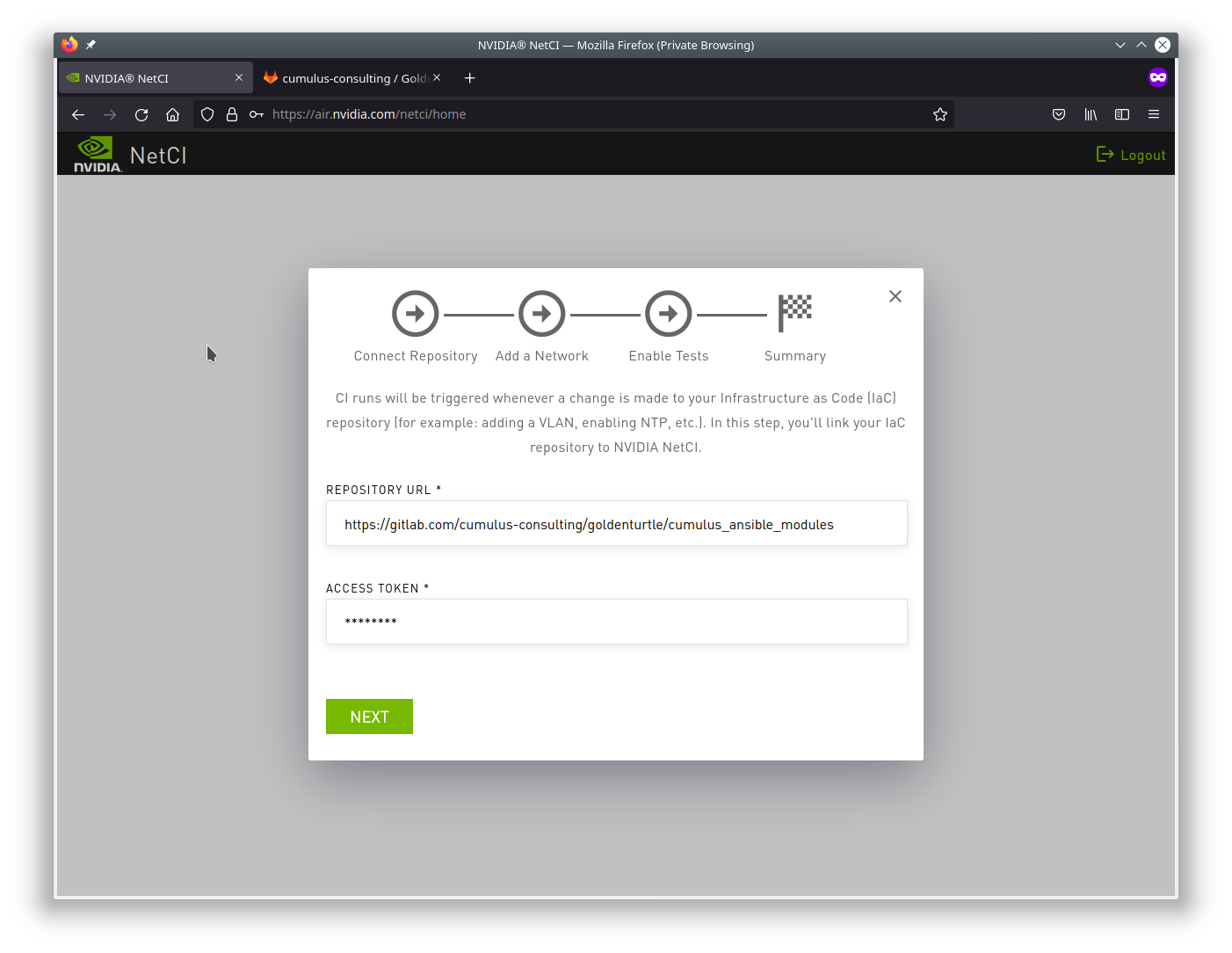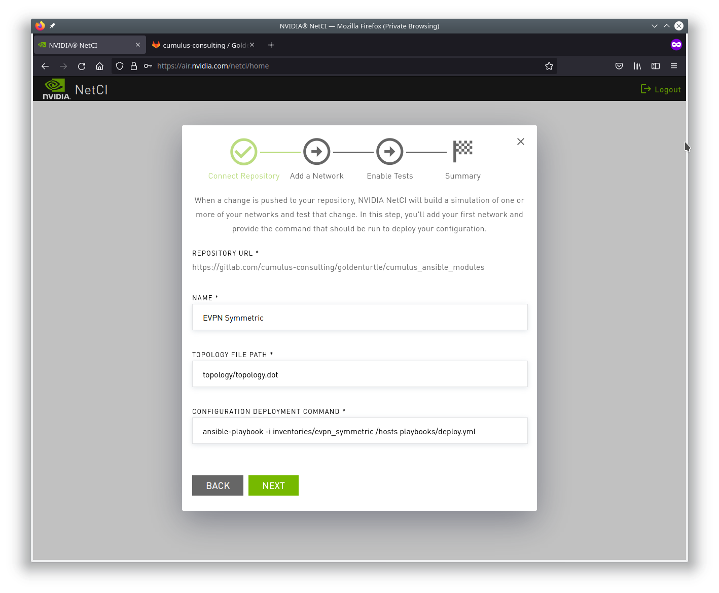 You must link to your git repository and allow the NVIDIA Air NetCI platform access to read the repository.