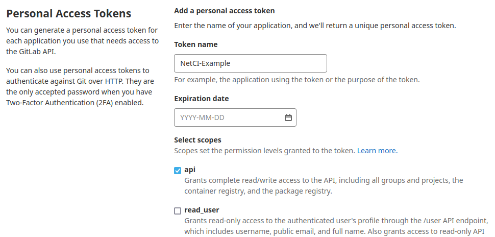 Create an access token by giving it a name and make sure to select api as the selected scope.