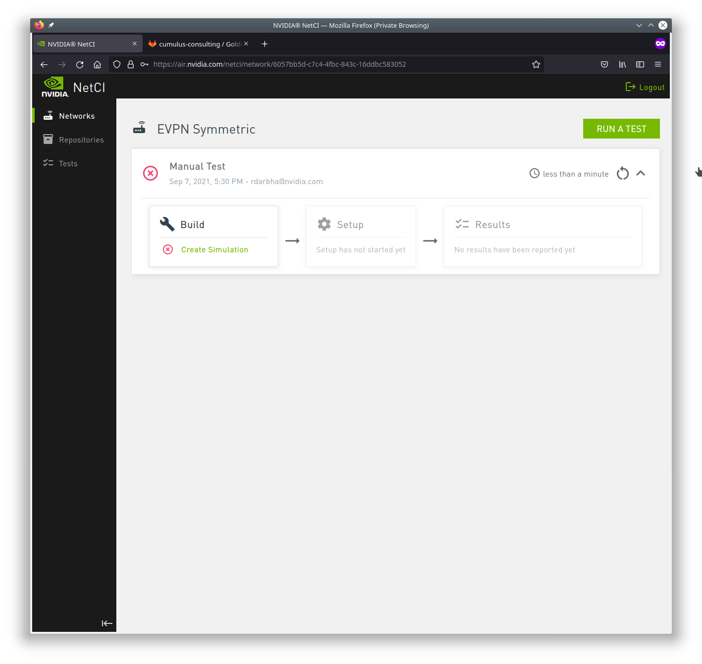 NVIDIA Air Continuous Integration is currently in early beta testing. To take part in the beta, reach out to the NVIDIA Cumulus in the Cloud (CITC) team at citc-support@nvidia.com.