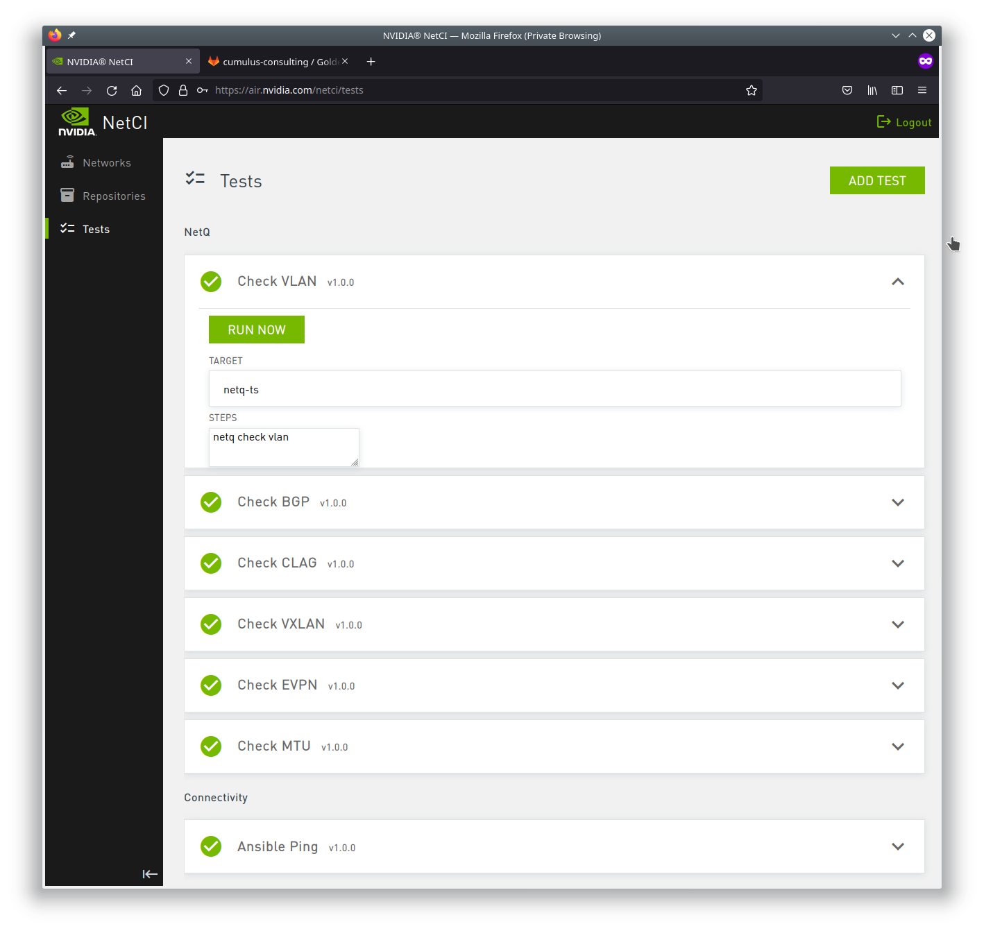 The NetCI environment has a redefined standard set of tests that rely on NVIDIA NetQ as the backend validation tool.