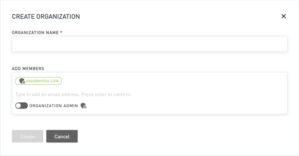 Provide a name for the organization and the email address of each member you want to add. If you want a member to be an administrator, select the Organization Admin toggle.