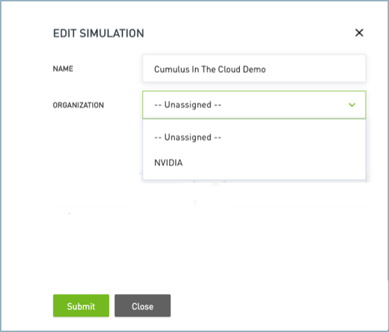 To assign a simulation to an organization, click the Edit icon to open the Edit Simulation dialog. Select the organization from the Organization dropdown menu, then click Submit.