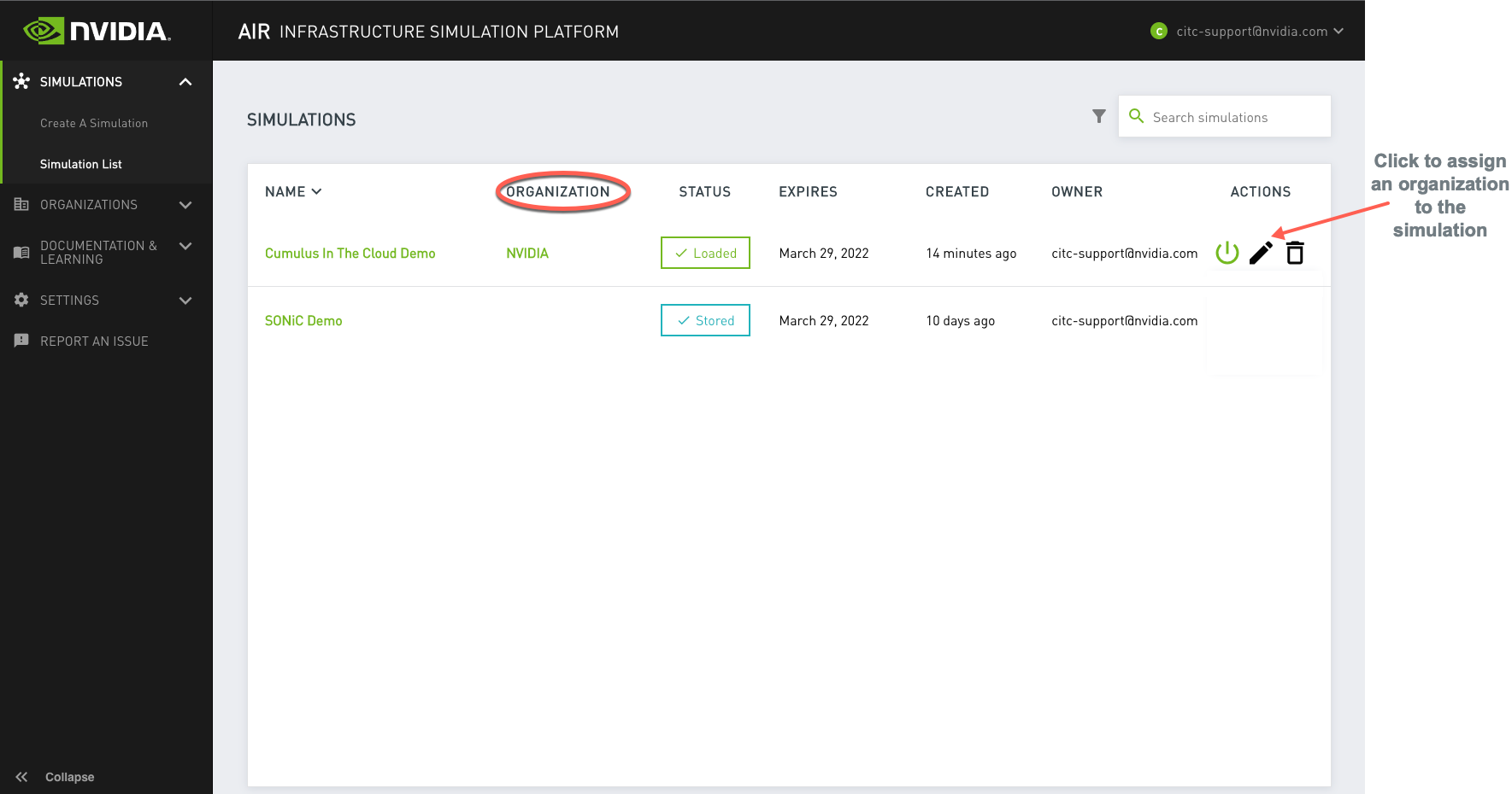 In the simulation list, the Organization column shows the organization to which the simulation belongs.