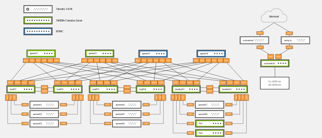 In the Cumulus and SONiC In The Cloud demo, two spines in the reference topology use SONiC as the network operating system and all the remaining nodes use Cumulus Linux.